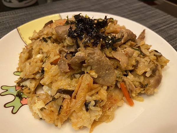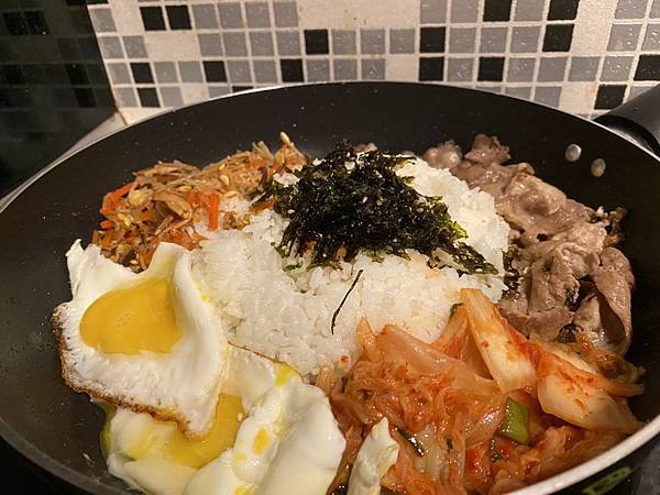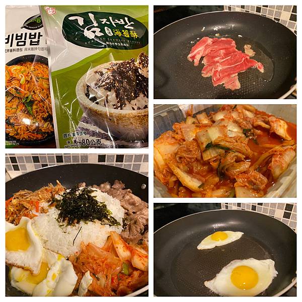沒錯 ! 整體來說只需要三個步驟,其他都是現成品拉,最後我們把白飯放在盤子正中間,周圍擺上豬肉片、調理包食材、煎蛋還有超好吃韓式泡菜,最後在白飯上點綴海苔酥就大功告成拉 !