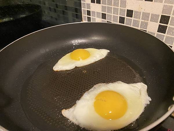 為了不讓蛋黃破裂,可以加多一點油,稍微搖晃一下讓蛋不沾鍋